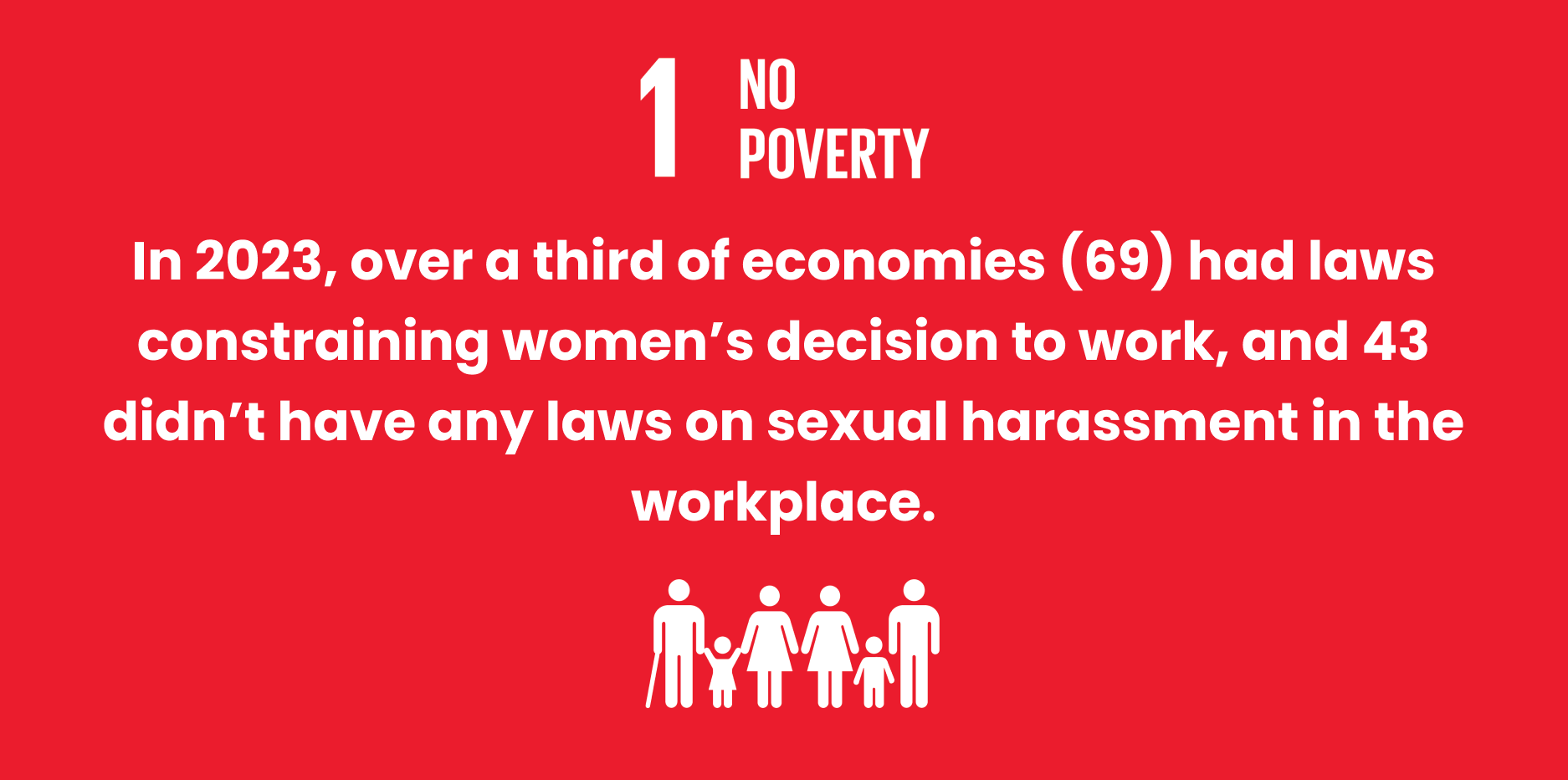 We cannot eradicate poverty, without eradicating gender inequality. Discriminatory policies and legal frameworks are at the root of women’s poverty as they restrict access to employment, income and inheritance, and land and property rights. In 2023, over a third of economies (69) had laws constraining women’s decision to work, and 43 didn’t have any laws on sexual harassment in the workplace. We must reform these laws (and follow through with implementation) to secure women’s rights and alleviate poverty, achieving SDG 1.