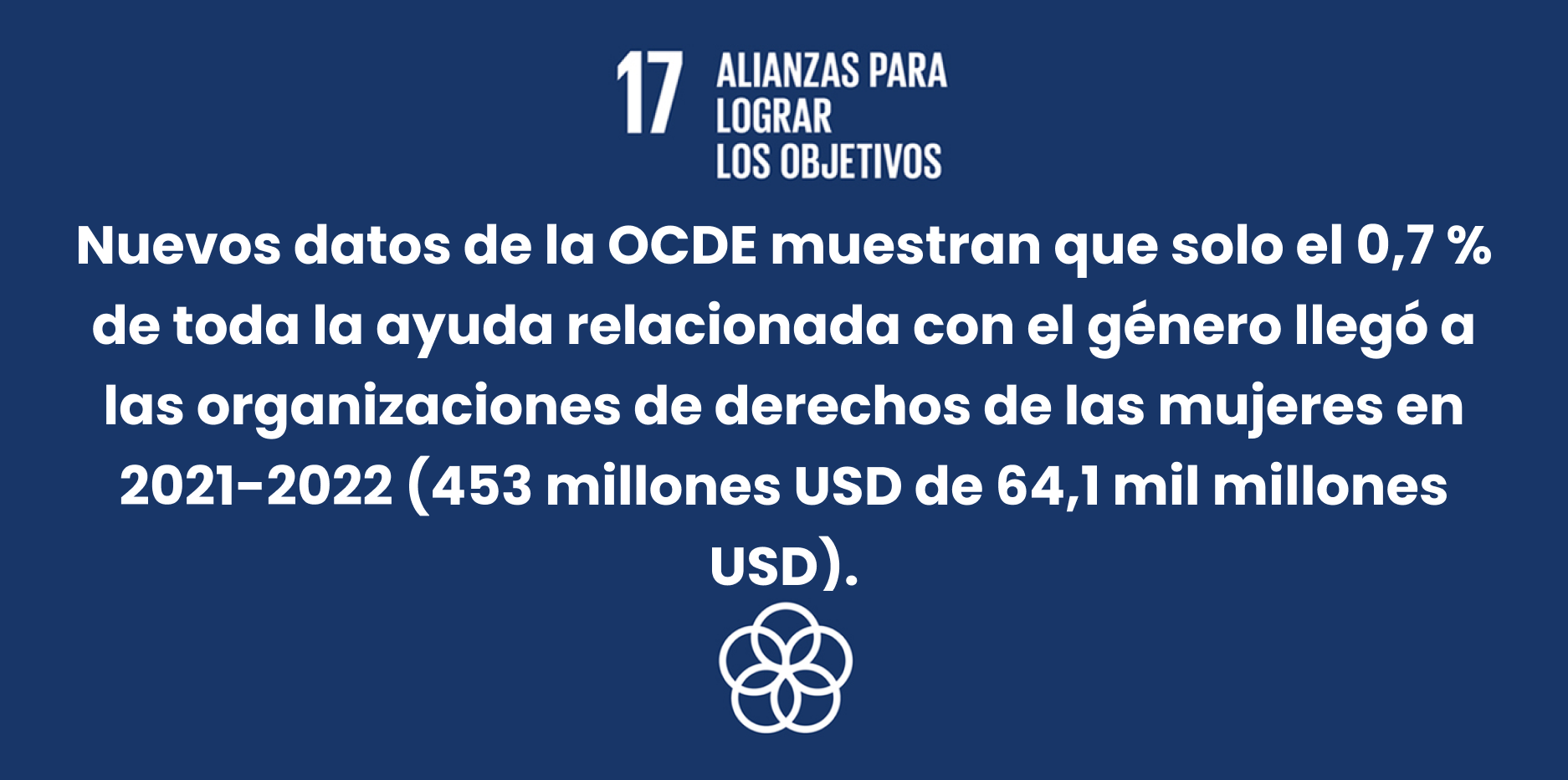 Simultáneamente, estamos viendo recortes en la cantidad de Ayuda Oficial al Desarrollo que se destina específicamente a la igualdad de género y en la cantidad de financiación que llega a los movimientos por los derechos de las mujeres. Los movimientos por los derechos de las mujeres y las organizaciones de la sociedad civil feminista están haciendo un trabajo crucial para avanzar en cada uno de los objetivos y asegurarse de que nadie se quede atrás, pero están gravemente subfinanciados. Para avanzar en la igualdad de género en todos los objetivos y apoyar el ODS 17, debemos aumentar la financiación para estos movimientos y organizaciones y su inclusión en los espacios de toma de decisiones. Como hemos visto en los otros objetivos, la participación y el conocimiento de mujeres y niñas son cruciales para adaptar nuestros esfuerzos y evitar dejar a nadie atrás. Para seguir avanzando en la igualdad de género y el ODS 17, debemos desarrollar alianzas más sólidas entre la sociedad civil feminista, los gobiernos y el sector privado, asegurándonos de que la sociedad civil feminista sea escuchada y dotada de recursos, y debemos comprometernos a integrar la igualdad de género en todos los objetivos, su financiación y la forma en que monitoreamos su éxito.