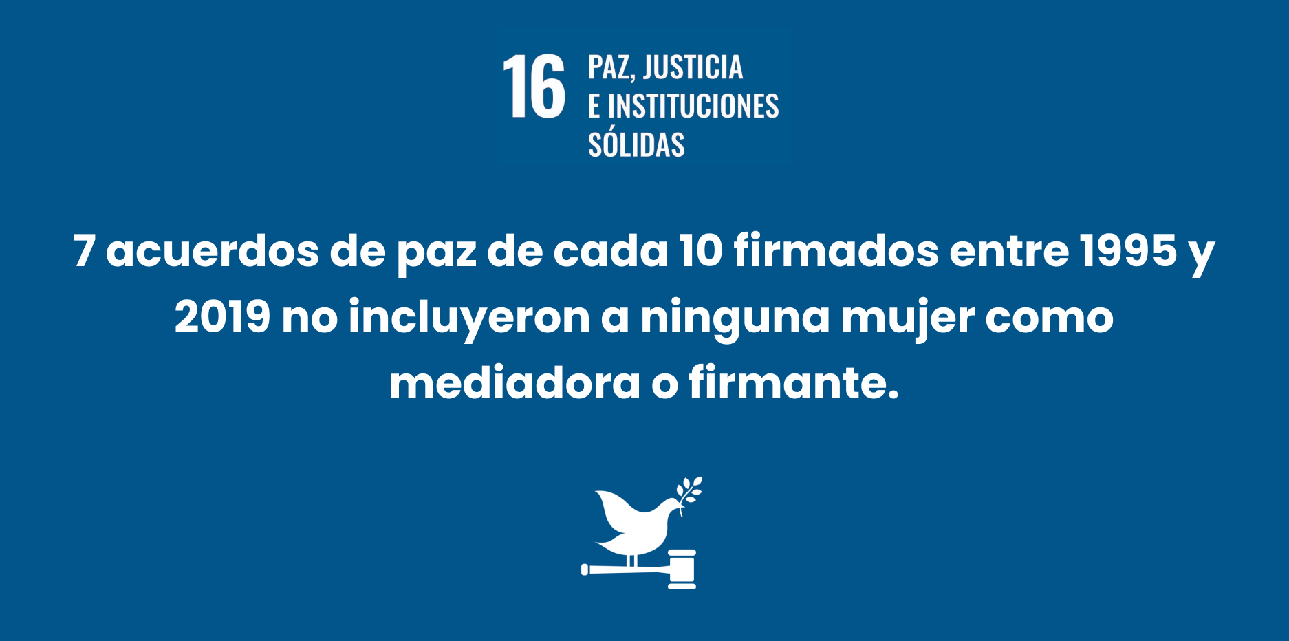 Poner fin a la violencia contra las mujeres y las niñas es un paso fundamental para alcanzar sociedades pacíficas e inclusivas. La plena participación de las mujeres en los procesos de liderazgo y toma de decisiones es crucial para la prevención de conflictos y la consolidación de la paz. Su participación en los procesos de paz aumenta la durabilidad y la implementación de los acuerdos, haciéndolos un 35 % más propensos a durar al menos 15 años. A pesar de esto, 7 de cada 10 acuerdos de paz firmados entre 1995 y 2019 no incluían a ninguna mujer mediadora o firmante. Esto llevó a que 4 de cada 5 acuerdos de paz durante ese período no hicieran referencia alguna a mujeres, niñas y género, y solo el 6 % contenían al menos una disposición para abordar específicamente la violencia contra las mujeres. Proteger los derechos de las mujeres y asegurar su participación activa en los sistemas de gobernanza y justicia es crucial para construir sociedades más estables y justas.