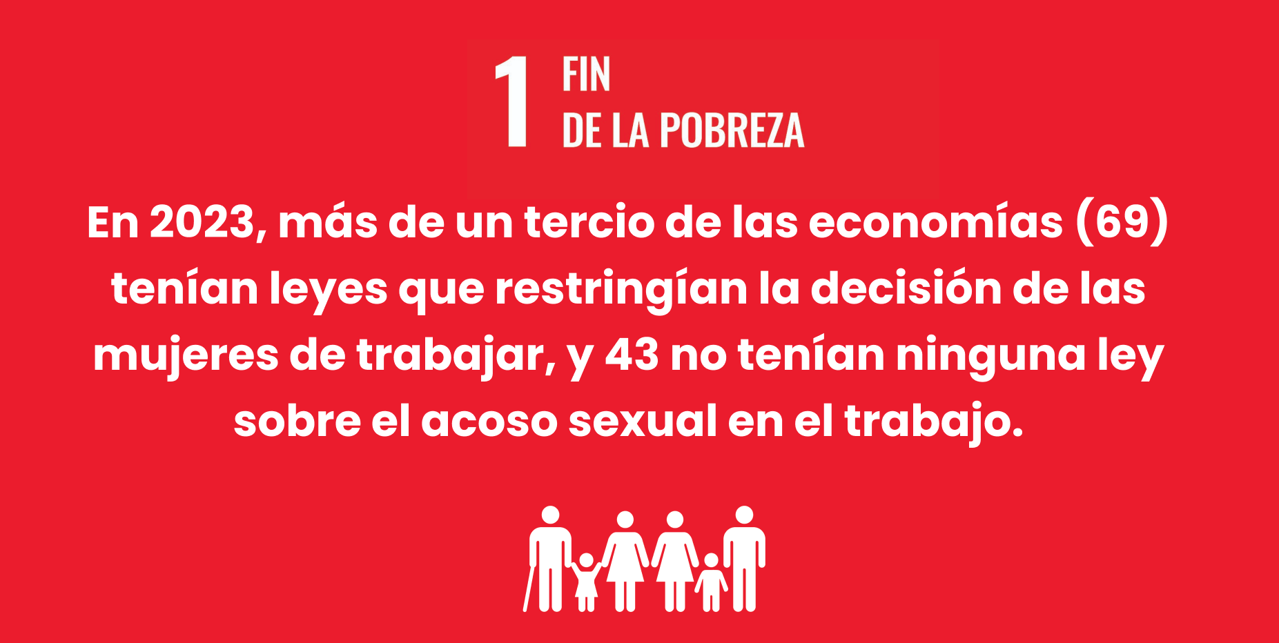 No podemos erradicar la pobreza sin erradicar las desigualdades de género. Las políticas y marcos jurídicos discriminatorios están en la raíz de la pobreza de las mujeres, ya que restringen el acceso al empleo, a los ingresos, a la herencia, y a los derechos de tierras y propiedades. En 2023, más de un tercio de las economías (69) tenían leyes que limitaban la decisión de las mujeres de trabajar, y 43 no tenían leyes sobre el acoso sexual en el trabajo. Debemos reformar estas leyes (y asegurar su implementación) para garantizar los derechos de las mujeres y aliviar la pobreza, alcanzando así el ODS 1.