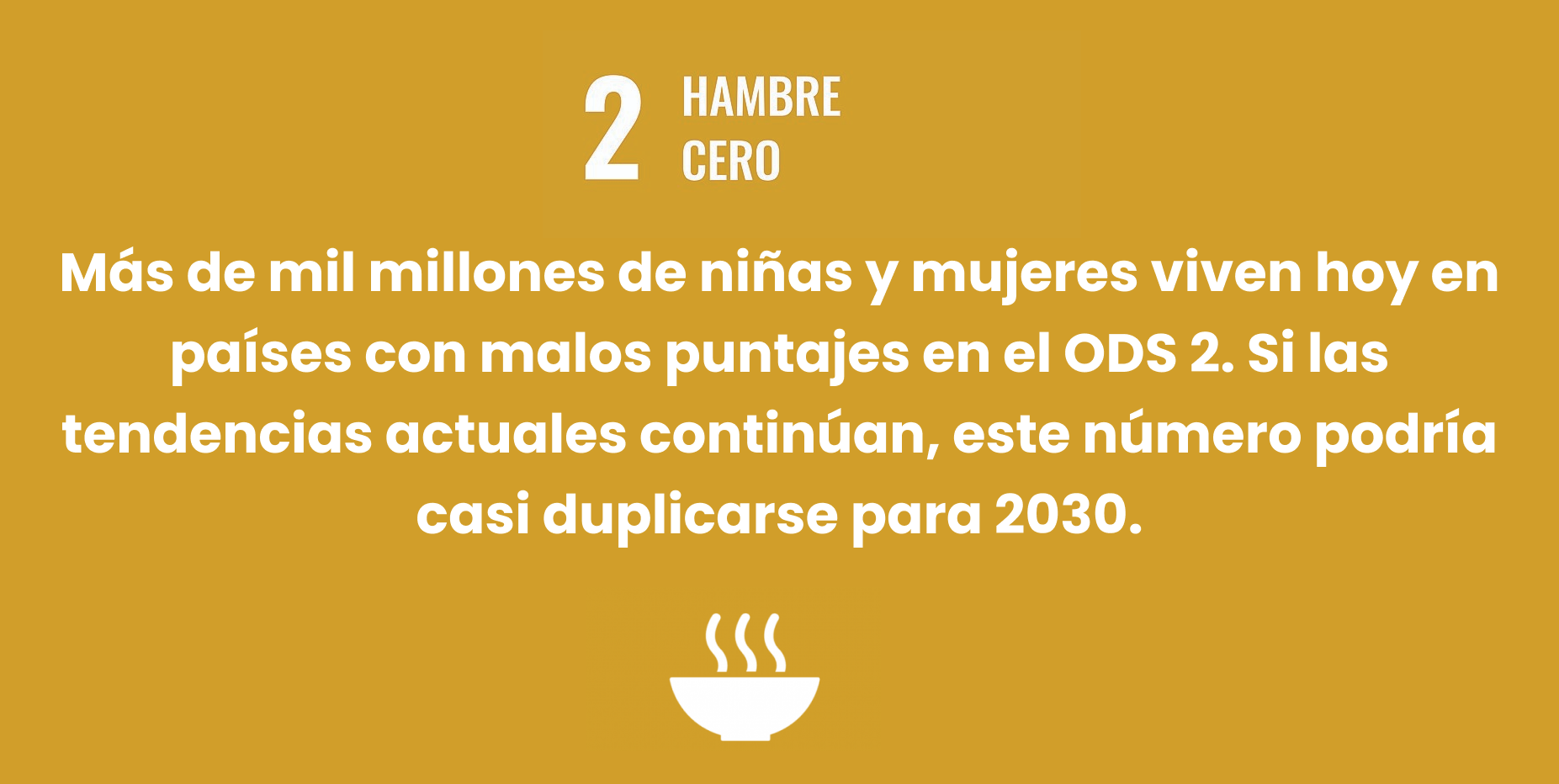 Las mujeres juegan un papel crucial en la producción, transformación y distribución de alimentos, haciendo que su participación sea esencial para alcanzar las metas de productividad agrícola y nutrición del ODS 2. En tiempos de crisis alimentarias, las mujeres a menudo priorizan las necesidades de sus familias sobre las propias, destacando su vulnerabilidad y la necesidad de intervenciones específicas. Asegurar la plena y efectiva participación de las mujeres en la toma de decisiones agrícolas puede mejorar significativamente la seguridad alimentaria y los resultados nutricionales. Hoy en día, más de mil millones de niñas y mujeres viven en países con bajos puntajes en el ODS 2, y si las tendencias actuales continúan, este número podría casi duplicarse para 2030.
