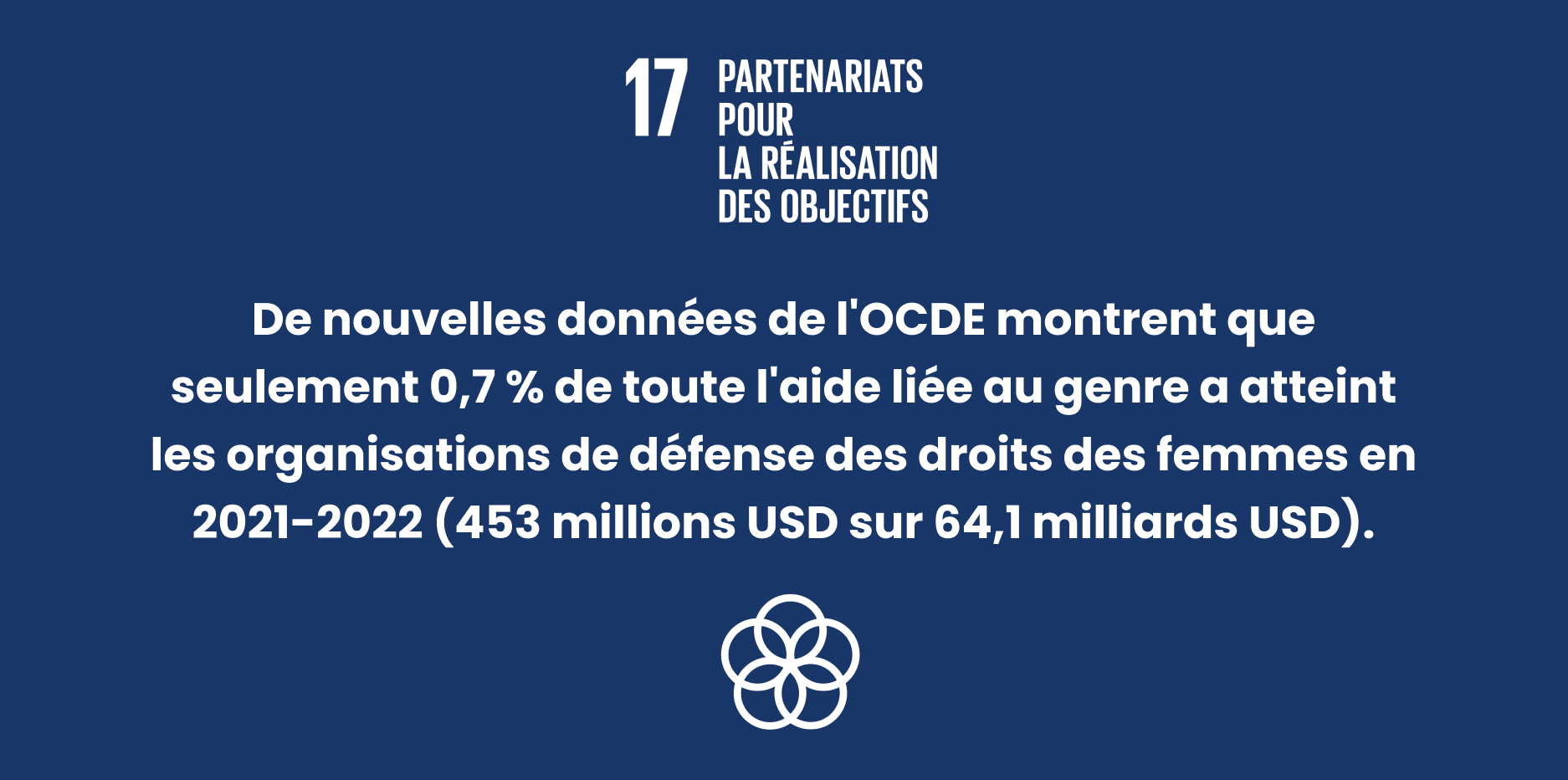 Nous assistons simultanément à des réductions de l’aide publique au développement ciblant spécifiquement l’égalité de genre et du financement atteignant les mouvements pour les droits des femmes. Les mouvements pour les droits des femmes et les organisations de la société civile féministe font un travail crucial pour faire progresser chaque objectif et s’assurer que personne n’est laissé pour compte, mais ils sont sévèrement sous-financés. Pour faire progresser l’égalité de genre dans tous les objectifs et soutenir l’ODD 17, nous devons augmenter le financement de ces mouvements et organisations et leur inclusion dans les espaces de prise de décision. Comme nous l’avons vu à travers les autres objectifs, la participation et les connaissances des femmes et des filles sont cruciales pour adapter nos efforts et éviter de laisser quiconque de côté. Pour continuer à faire avancer l’égalité de genre et l’ODD 17, nous devons développer des partenariats plus solides entre la société civile féministe, les gouvernements et le secteur privé, en veillant à ce que la société civile féministe soit entendue et dotée de ressources, et nous devons nous engager à intégrer l’égalité de genre dans tous les objectifs, leur financement et la manière dont nous surveillons leur succès.