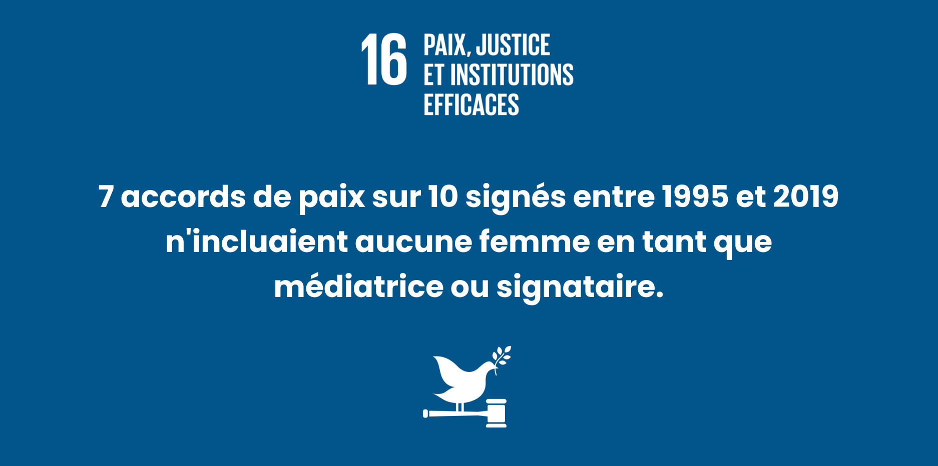 Mettre fin à la violence contre les femmes et les filles est une étape fondamentale pour atteindre des sociétés pacifiques et inclusives. La participation pleine des femmes aux processus de leadership et de prise de décision est cruciale pour la prévention des conflits et la consolidation de la paix. Leur participation aux processus de paix augmente la durabilité et la mise en œuvre des accords, les rendant 35 % plus susceptibles de durer au moins 15 ans. Malgré cela, 7 accords de paix sur 10 signés entre 1995 et 2019 n’incluaient aucune femme médiatrice ou signataire. Cela a conduit à ce que 4 accords de paix sur 5 durant cette période ne fassent aucune référence aux femmes, aux filles et au genre, et seulement 6 % contiennent au moins une disposition pour traiter spécifiquement de la violence contre les femmes. Protéger les droits des femmes et assurer leur implication active dans les systèmes de gouvernance et de justice est crucial pour construire des sociétés plus stables et justes.