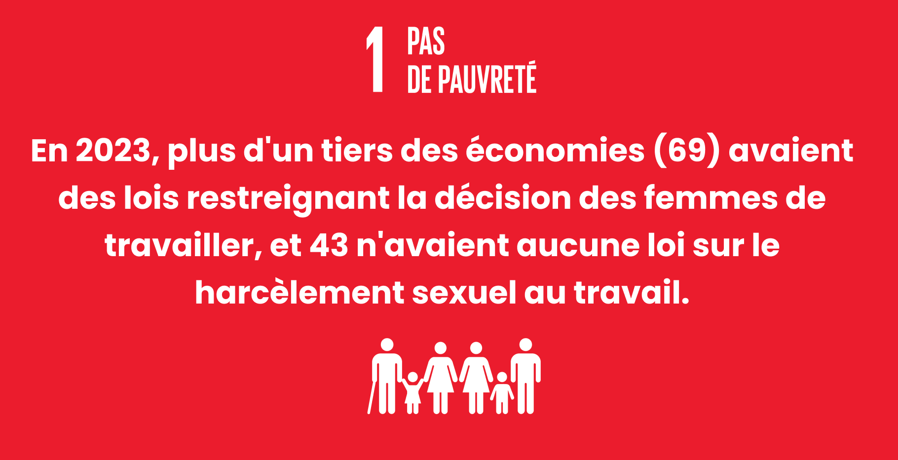 Nous ne pouvons pas éradiquer la pauvreté sans éradiquer les inégalités de genre. Les politiques et les cadres juridiques discriminatoires sont à la racine de la pauvreté des femmes, car ils restreignent l’accès à l’emploi, aux revenus, à l’héritage, et aux droits fonciers et de propriété. En 2023, plus d’un tiers des économies (69) avaient des lois limitant la décision des femmes de travailler, et 43 n’avaient pas de lois sur le harcèlement sexuel au travail. Nous devons réformer ces lois (et assurer leur mise en œuvre) pour garantir les droits des femmes et alléger la pauvreté, atteignant ainsi l’ODD 1.