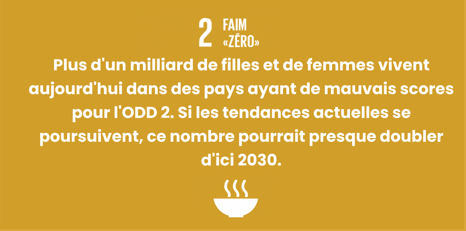 Les femmes jouent un rôle crucial dans la production, la transformation et la distribution des aliments, rendant leur participation essentielle pour atteindre les cibles de productivité agricole et de nutrition de l’ODD 2. En période de crises alimentaires, les femmes priorisent souvent les besoins de leurs familles par rapport aux leurs, soulignant leur vulnérabilité et la nécessité d’interventions ciblées. Assurer la participation pleine et effective des femmes dans la prise de décisions agricoles peut significativement améliorer la sécurité alimentaire et les résultats nutritionnels. Aujourd’hui, plus d’un milliard de filles et de femmes vivent dans des pays ayant de mauvais scores sur l’ODD 2, et si les tendances actuelles continuent, ce nombre pourrait presque doubler d’ici 2030.