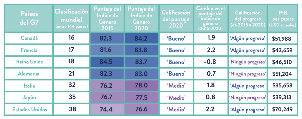 La cumbre anual del G7 está a punto de llevarse a cabo en Hiroshima, Japón. Como muestran los datos del Índice de EM2030, los países del G7 tienen mucho por hacer para cerrar las brechas de género  “en casa”. En los últimos años, ninguno de los países del G7 tuvo un “progreso rápido” en igualdad de género, y tres de ellos (Reino Unido, Alemania y Japón) no hicieron “ningún progreso”.