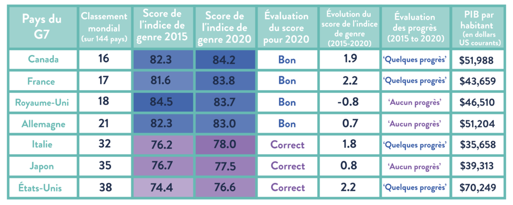 Les dirigeants du Groupe des sept (G7) sont sur le point de se réunir à Hiroshima au Japon, à l’occasion de leur Sommet annuel. Selon les données de l’Indice d’EM2030, les pays du G7 devront déployer beaucoup plus d’efforts pour combler les disparités entre les genres au niveau national. Ces dernières années, aucun des pays du G7 n’a réalisé de « progrès rapides » relativement à l’égalité des genres et trois d’entre eux (le Royaume-Uni, l’Allemagne et le Japon) n’ont accompli absolument « aucun progrès ».